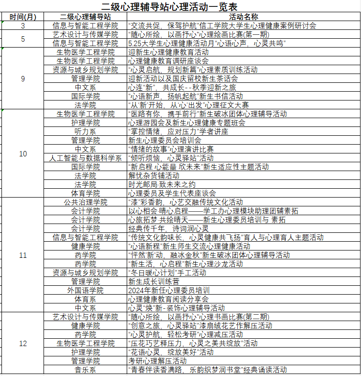 2024年,各院系二级心理辅导站结合本院系的特点与实际,承办学校心理健康教育咨询中心心理培训、活动,组织开展学生心理健康教育活动40项,发挥了学校心理健康教育网络体系重要枢纽的作用。