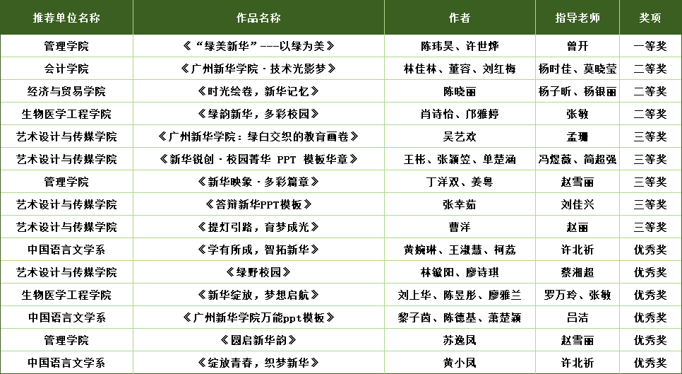 由太阳集团2138网址太阳集团2138网址举办的“新华模YOUNG 青年创”校园PPT模板设计大赛已圆满落下帷幕。本次大赛获得了各院系单位的积极响应,经院系推荐,共收到来自15个院系的83份PPT模板作品。主办方组织评审团对作品进行了综合评选,按照公平公正原则,经过初审、复审环节,评选出一等奖1名、二等奖3名、三等奖5名以及优秀奖6名。