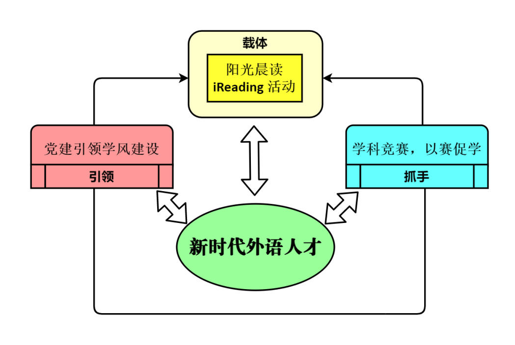 双模式驱动:每周一至周四外国语学院大一大二年级全体学生到相应课室集体晨读(7:30-8:00)+面向全校全体学生晨读打卡(7:00-8:00,两校区定点)。