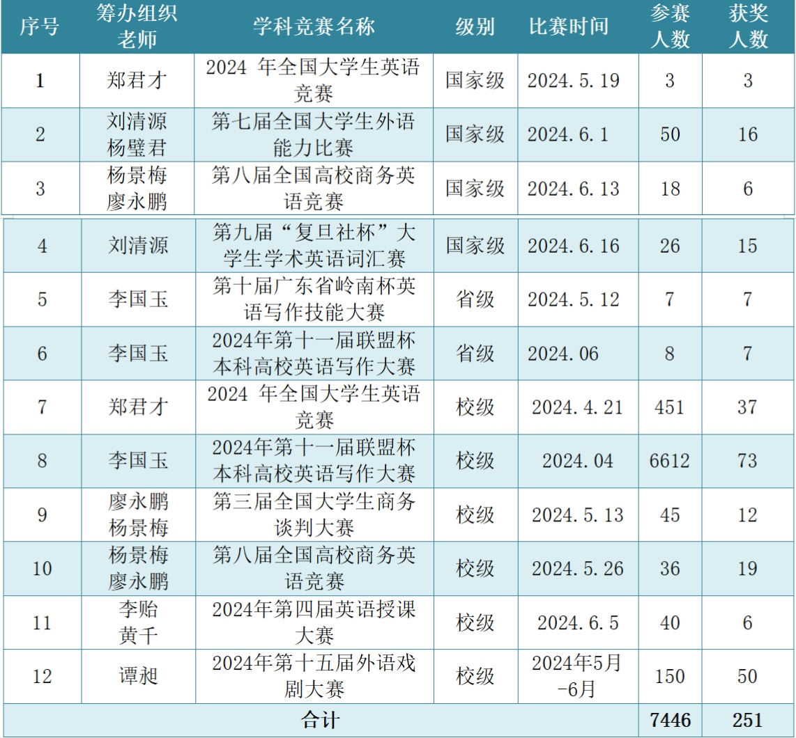 2.2024 年,学生在各类专业赛事中斩获佳绩,共获得国家级奖项 10 余项、省级奖项 20 余项,校级奖项 50 余项。其中,在2024年全国大学生英语竞赛中,3人参赛全部获奖;在第九届“复旦社杯”大学生学术英语词汇赛中,26人参赛,15人获奖;在第十届广东省岭南杯英语写作技能大赛中,7人参赛全部获奖。